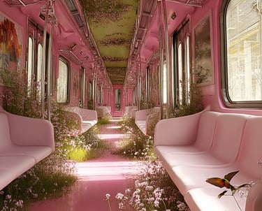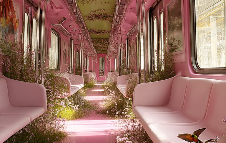 This artwork transforms an ordinary subway into a dreamlike sanctuary bathed in shades of pink. Nature reclaims the space with delicate flowers and soft grass, while light filters in to reveal a surreal harmony between urban life and organic beauty. A gentle symbol of rebirth, freedom, and the poetic resilience of the soul.