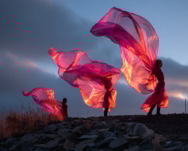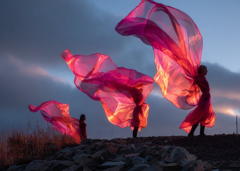 In this artwork, flowing fabrics catch the last glow of the setting sun, transforming movement into pure poetry. The figures, wrapped in luminous veils of pink and red, embody freedom, strength, and connection with nature. A celebration of light, emotion, and the boundless expression of the human spirit.