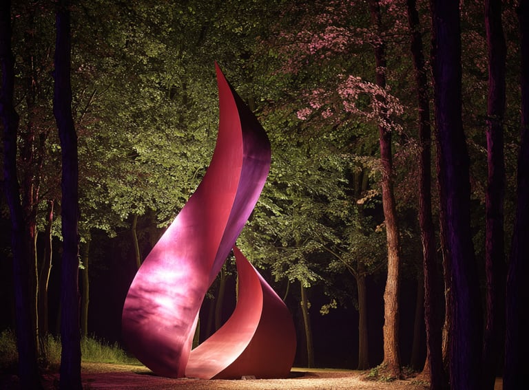 Amid the stillness of the forest, a luminous sculpture rises like a flame, twisting upward with strength and elegance. Its radiant hues of pink and purple reflect both fire and serenity, symbolizing transformation, inner power, and the eternal spark of the human spirit. A meeting point between nature, art, and the mystery of light.